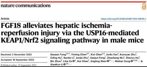 Prof. Jingling SHEN from College of Life and Environmental Science Publishes Academic Paper in Nature Communications Recently, Professor Jingling SHEN from the College of Life and Environmental Science, in collaboration with Academician Xiaokun LI from Wenzhou Medical University, published a research paper online in Nature Communications titled "FGF18 alleviates hepatic ischemia-reperfusion injury via the USP16-mediated KEAP1/Nrf2 signaling pathway in male mice". The study discovered that FGF18 reduces oxidat...2023-04-17
