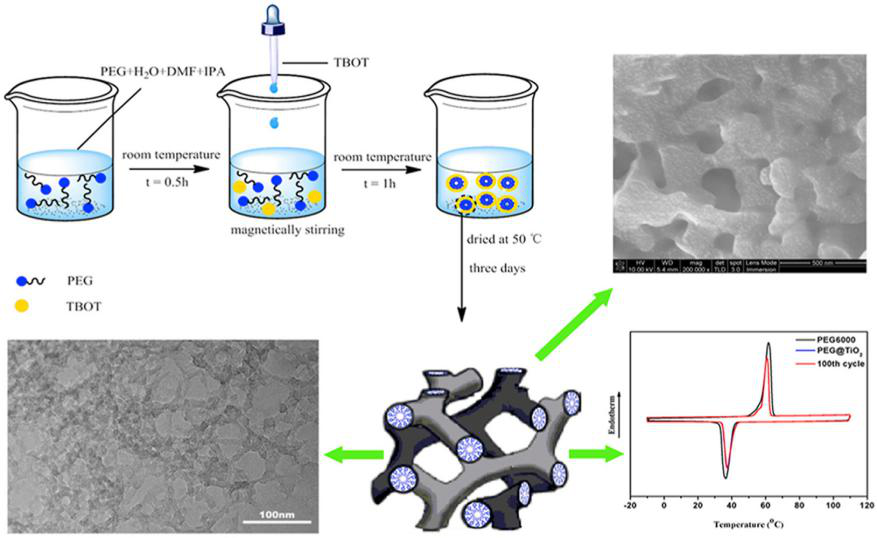 The Title of the Paper: Shape-stabilized composite phase change material PEG@TiO2 through in situ encapsulation of PEG into 3D nanoporous TiO2 for thermal energy storageAbstract: To synthesize PEG@TiO2 with excellent energy storage properties, polyethylene glycol (PEG) was in situ encapsulated for the first time into the pores of three-dimensional (3D) porous TiO2. PEG was surrounded by the hyd...