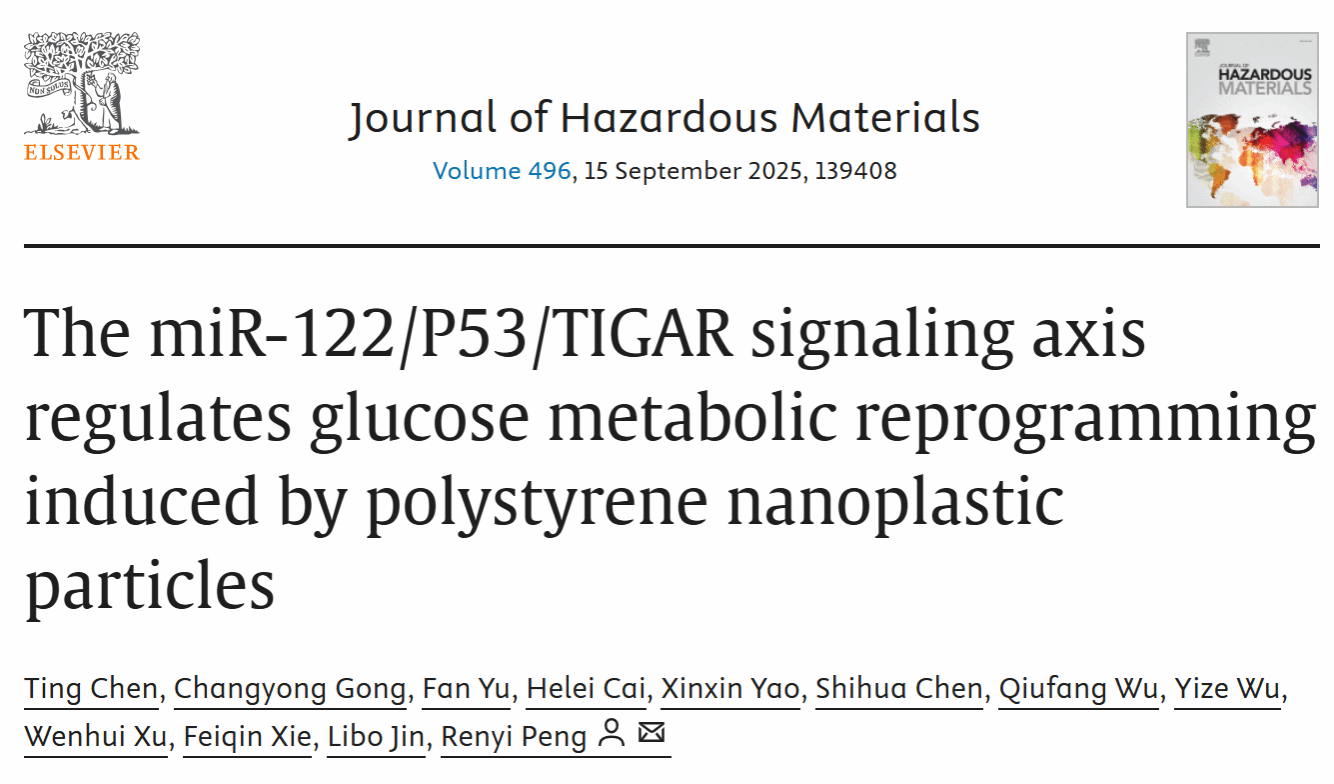 近日,小宝影院 生命与环境科学学院彭仁义课题组在中科院一区期刊《Journal of Hazardous Materials》(IF=11.3)发表了题为“The miRNA-122/P53/TIGAR signaling axis regulates glucose metabolic reprogramming induced by polystyrene nanoplastic particles”最新研究。该研究聚焦聚苯乙烯纳米塑料(PS-NPs)污染这一全球性威胁,深入探究其通过靶向miRNA-122对糖代谢重编程的复杂影响机制。