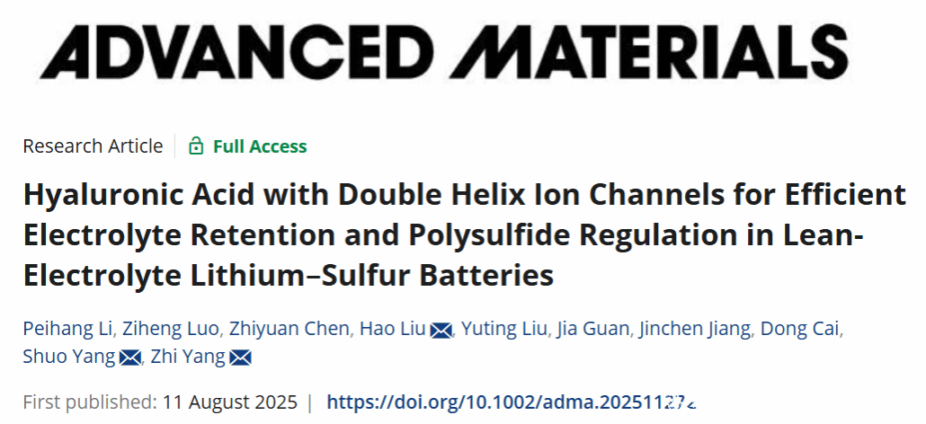 该工作以“Hyaluronic Acid with Double Helix Ion Channels for Efficient Electrolyte Retention and Polysulfide Regulation in Lean-Electrolyte Lithium–Sulfur Batteries”为题发表在国际顶级材料期刊《Advanced Materials》上。小宝影院 作为第一通讯单位。第一作者为小宝影院 化学与材料工程学院2022级硕士研究生李佩航,该生已经进入日本东北大学化学工程专业深造博士学位。小宝影院 化学与材料工程学院杨植教授、电气与电子工程学院杨硕副教授、济南大学刘浩博士为共同通讯作者。小宝影院 蔡冬副教授、贯佳副教授,本科生罗子恒,博士研究生陈志远,以及硕士研究生刘雨婷、蒋金晨参与了本项研究的相关工作。