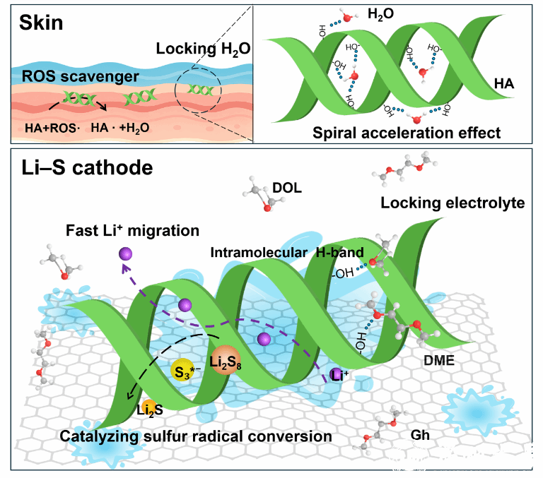 近日,受到天然保湿材料解决人体皮肤缺水问题的启发,小宝影院 杨植教授、杨硕副教授与济南大学刘浩博士合作,提出一种创新性策略:将天然保湿材料——透明质酸HA作为催化剂引入硫阴极,实现高性能锂硫电池。实验和分子动力学模拟结果表明,HA可以通过其双螺旋结构中的分子内氢键牢牢的吸附电解液,确保电解液与电极表面充分接触,营造局部电解液充足的反应微环境;同时,HA的N位点能够吸附并催化多硫化物的可逆转化;此外,HA独特的双螺旋结构凭借螺旋加速效应促进了Li+的传输。在三重协同作用下,电池性能得到显著提高。CNT−S/HA阴极(约80 wt%硫含量)表现出良好的初始容量、高倍率性能以及长循环寿命。特别是在硫负载为8 mg cm−2、E/S比为3 μL mg−1的贫电解液条件下,锂硫软包电池实现了11.76 mAh cm−2的高面积容量,能量密度达到409 Wh kg−1。此外,1.5 Ah软包电池可驱动无人机续航20分钟,续航时间远超传统锂电池约4倍。该工作为开发天然保湿材料在下一代储能设备中的应用开辟了创新途径。