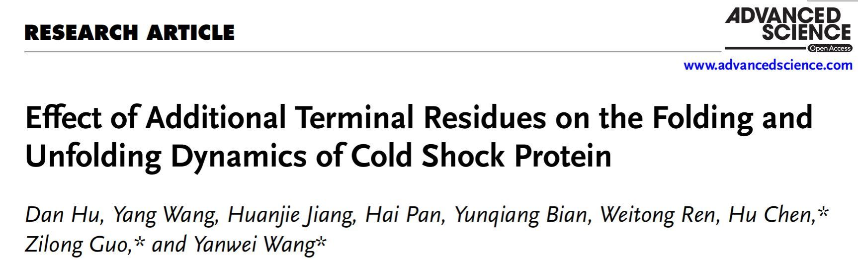 该成果以“Effect of Additional Terminal Residues on the Folding and Unfolding Dynamics of Cold Shock Protein”为题,发表在Advanced Science上(一区,IF=15)。小宝影院 2022级硕士研究生胡丹为论文第一作者。小宝影院 王艳伟副教授、厦门大学陈虎教授、国科温州研究院郭子龙副研究员为论文共同通讯作者,小宝影院 为第一通讯单位。相关工作得到国家自然科学基金和浙江省自然科学基金的支持。