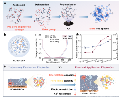 近日,小宝影院 化材学院吴星樵/侴术雷联合浙江大学范修林提出了一种硬碳负极的多尺度孔调控策略,有效解决了兼顾高比容量与高体积容量这一长期存在的难题。实验数据与理论计算表明,在水热过程中,乙酸改变了水热炭的疏水性,促进了分散性球形颗粒的形成,并提升了材料的压实密度。预孔工程策略可增加水热炭的自由体积与开放孔结构:其中,酯化反应形成的自由体积有利于最终硬碳中封闭孔结构的构建,而氧化刻蚀产生的开放孔则便于硬碳后续形成微孔结构。得益于对硬碳材料微观与介观尺度的双重调控,该材料展现出优异的电化学性能,其可逆容量达 375.40 mAh/g,首次库伦效率达 90.10%。当厚电极受到更高压实处理时,其球形形貌使其仍能保持较高的克容量(359.49 mAh/g),同时体积比容量得到提升(390.30 mAh/cm³)。与普鲁士蓝正极组装成扣式全电池时,电池能量密度高达 318.44 Wh/kg。值得注意的是,在宏观层面阐明了在低电位下,实验室规模与实际应用级电极中钠嵌入及孔填充过程背后的机制,为开发高能量密度钠离子电池提供了宝贵指导。该研究成果以" High-Compaction Spherical Carbon with Tunable Rich Pore Structures for Efficient Sodium Storage"为题,发表在国际顶级期刊《Advanced Materials》上。小宝影院 为第一通讯单位,第一作者是小宝影院 化材学院2025届硕士陈青杭。小宝影院 化材学院吴星樵博士、侴术雷教授、及浙江大学范修林教授为论文共同通讯作者。相关工作受到国家自然科学基金,浙江省自然科学基金等基金的资助。