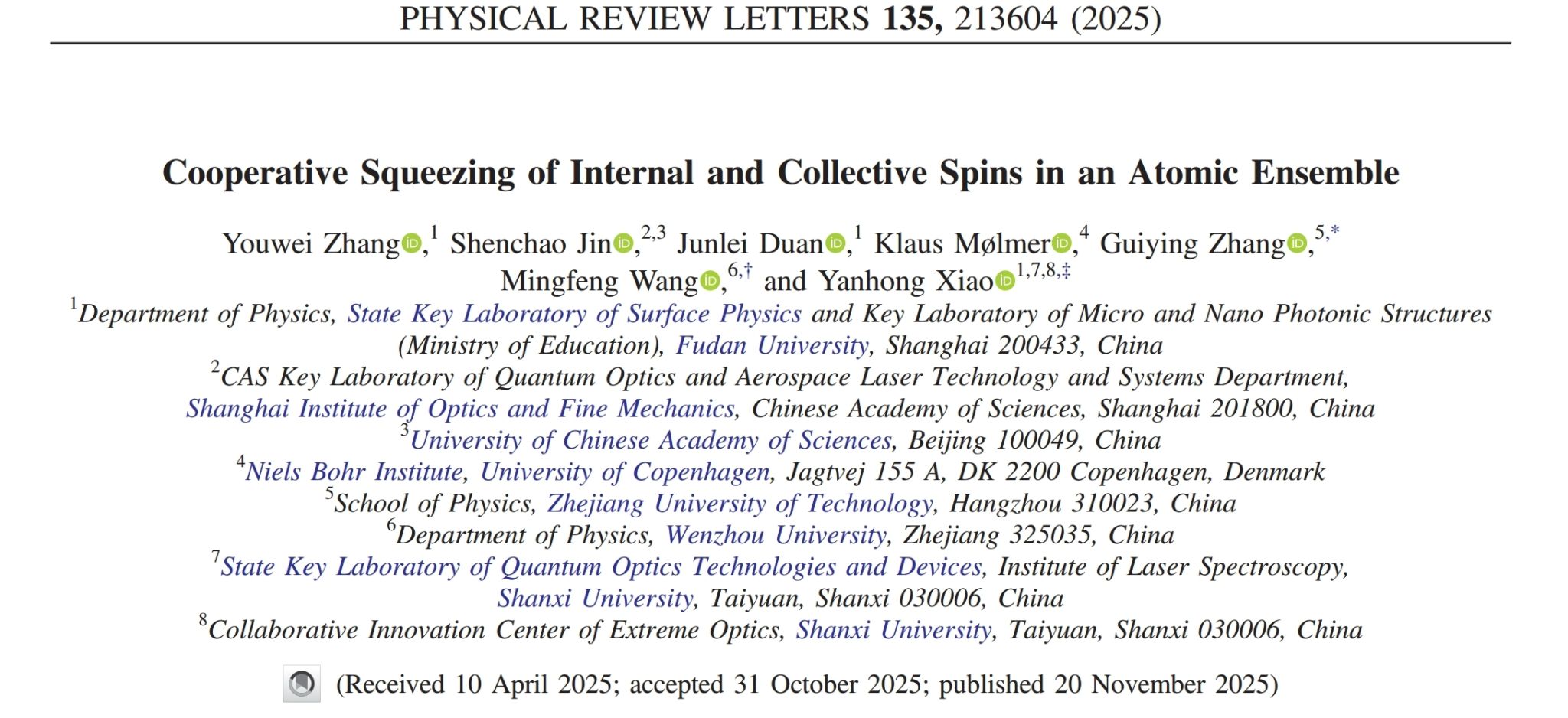 相关研究结果以题“Cooperative Squeezing of Internal and Collective Spins in an Atomic Ensemble”发表于近期的《Physical Review Letters》上,小宝影院 小宝影院 王明锋副教授、复旦大学肖艳红教授和浙江工业大学张桂迎副教授为论文共同通讯作者,博士生张有为为论文的第一作者,哥本哈根大学Klaus Mølmer教授为该工作提供了重要指导。该项目获得了“量子通信与量子计算机”国家科技重大专项、上海市科学技术委员会项目、国家自然科学基金、山西省“1331工程”专项基金、浙江省自然科学基金,以及丹麦国家研究基金会的支持。