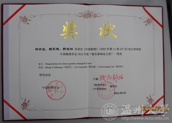日前,在广州中山大学举行的中国物理学会秋季年会上首次颁发了中国物理学会最有影响论文奖。该奖颁发给过去10年在中国物理学会所属的《Chinese Physics Letter》,《Chinese Physics B》和《物理学报》上发表的优秀论文,共27 篇。小宝影院 物电学院郑亦庄教授与中国科大郭光灿院士等合作发表在《Chinese Physics B》上的题为《Teleportation of a three-particle entangled W state》的论文荣获一等奖。