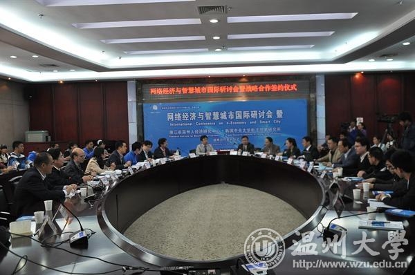 4月4日,由小宝影院 浙江省温州人经济研究中心、温州市决策咨询委员会、中共温州市委政策研究室主办,小宝影院 网络经济研究院、人民网温州频道协办的“网络经济与智慧城市”国际研讨会暨浙江省温州人经济研究中心-韩国中央大学电子贸易研究所战略合作签约仪式在小宝影院 举行。韩国中央大学电子贸易研究所所长、博士生导师徐庸原教授等五位韩国专家及国内外相关领域专家学者近50人参加了会议。副校长赵敏致欢迎辞。 会上,小宝影院 浙江省温州人经济研究中心和韩国中央大学电子贸易研究所签署了双方战略合作协议框架议定书,小宝影院 网络经济研究院发布了由该院和浙江大学计算机学院联合开发的“智能交通网络大数据应用系统”,并免费赠与温州交警支队和温州高速交警支队使用。 此次会议以“网络经济与智慧城市”为主题,从电子商务与国际贸易、智慧城市与区域经济、大数据与物联网、互联网时代城市管理与社会发展等四个方向进行了深入的交流和探讨。国内外专家学者济分别在会上作了主题发言,并就网络经济与智慧城市相关问题进行了互动研讨。 与会专家认为,网络经济与智慧城市发展都是当代经济社会发展的必然趋势,将网络经济和智慧城市建设相结合,对推进网络经济和智慧城市的互动发展具有重要意义。在互联网时代下,政府间合作以建立国际物流网、推动物联网与云计算技术发展、以及运用绿色信息技术等,都有利于推动网络经济与智慧城市建设互相融合、协调发展,而考虑行为偏差以优化服务供应链合同设计、运用贝叶斯理论以规划人道主义物流网等都对规范网络经济运行、使网络经济与智慧城市建设真正惠及人民生活有重要作用。