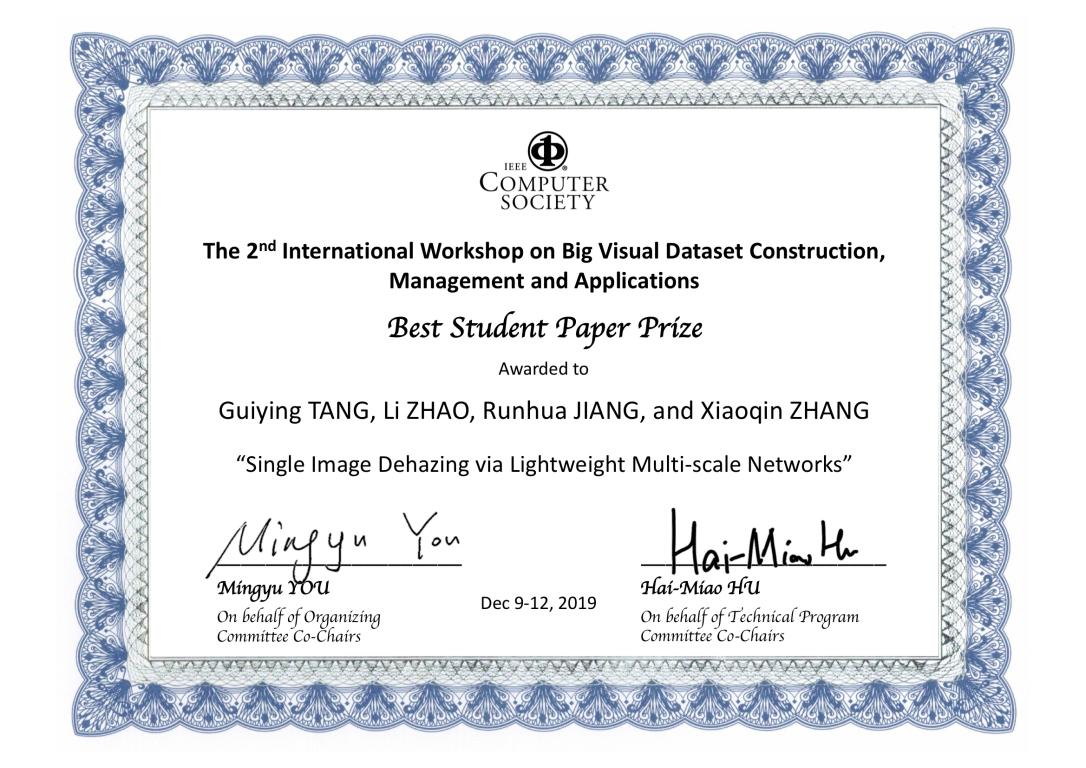 近日,在洛杉矶召开的第二届国际视觉大数据构建、管理与应用会议上,小宝影院 计算机与人工智能学院张笑钦教授指导的研究生唐贵英、蒋润华的论文《Single Image Dehazing via Lightweight Multi-scale Networks》从众多文章中脱颖而出,获得大会颁发的最佳学生论文奖。