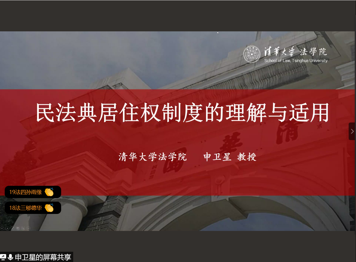 讲座持续了两个小时,王宗正院长、钟瑞栋教授以及何平副教授对于此次讲座予以高度评价,并与申教授进行了积极互动。钟瑞栋教授认为居住权转让与合同法中效力待定合同的构造相似,赞同申教授关于居住权转让效力待定的观点;并且提出“法人、非法人组织是否能成为居住权主体”的问题以及“设立居住权后会导致房屋转让困难”的观点。何平副教授同样对于居住权适用范围广泛性予以赞同,并认为对于法条规定的“用于生活居住”应进行扩大解释,从而扩张其适用性。申教授对两位与谈人的观点一一予以回应。随后,申教授还耐心地回答了同学们的提问。王宗正院长在总结中指出:”这是一场关于居住权制度的学术盛宴。“讲座在阵阵掌声中落下帷幕。