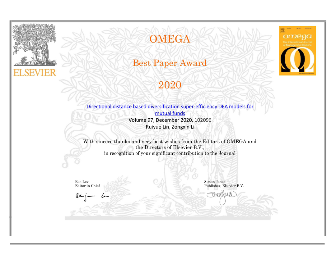 日前,国际顶级学术期刊《OMEGA-The International Journal of Management Science》公布2020年度最佳论文奖(Best Paper Award),小宝影院 小宝影院 副教授林瑞跃发表的论文《Directional distance based diversification super-efficiency DEA models for mutual funds》获得最佳论文奖!林瑞跃是获奖论文的第一作者,小宝影院 小宝影院 是通讯作者单位。