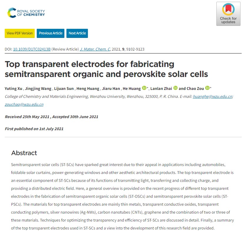近日,小宝影院 2019级材料科学与工程专业硕士研究生许宇婷在权威期刊Journal of Materials Chemistry C上发表题为Top transparent electrodes for fabricating semitransparent organic and perovskite solar cells(顶部透明电极在制备半透明有机和半透明钙钛矿太阳能电池方面的应用)的综述论文,通讯作者为邹超教授和黄合博士。