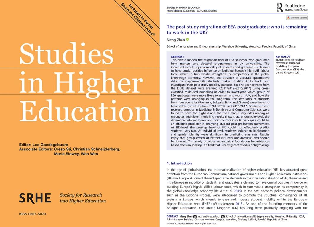 近日,教育学国际顶级期刊《Studies in Higher Education》接收了小宝影院 创新创业学院詹萌博士有关区域间高校毕业生流动的实证性论文“The post-study migration of EEA postgraduates: who is remaining to work in the UK? ”(欧洲经济区高校毕业生的跨国流动:关于留英工作群体的研究),詹萌博士为第一作者兼通讯作者,小宝影院 为第一通讯单位。