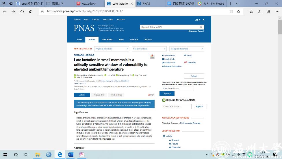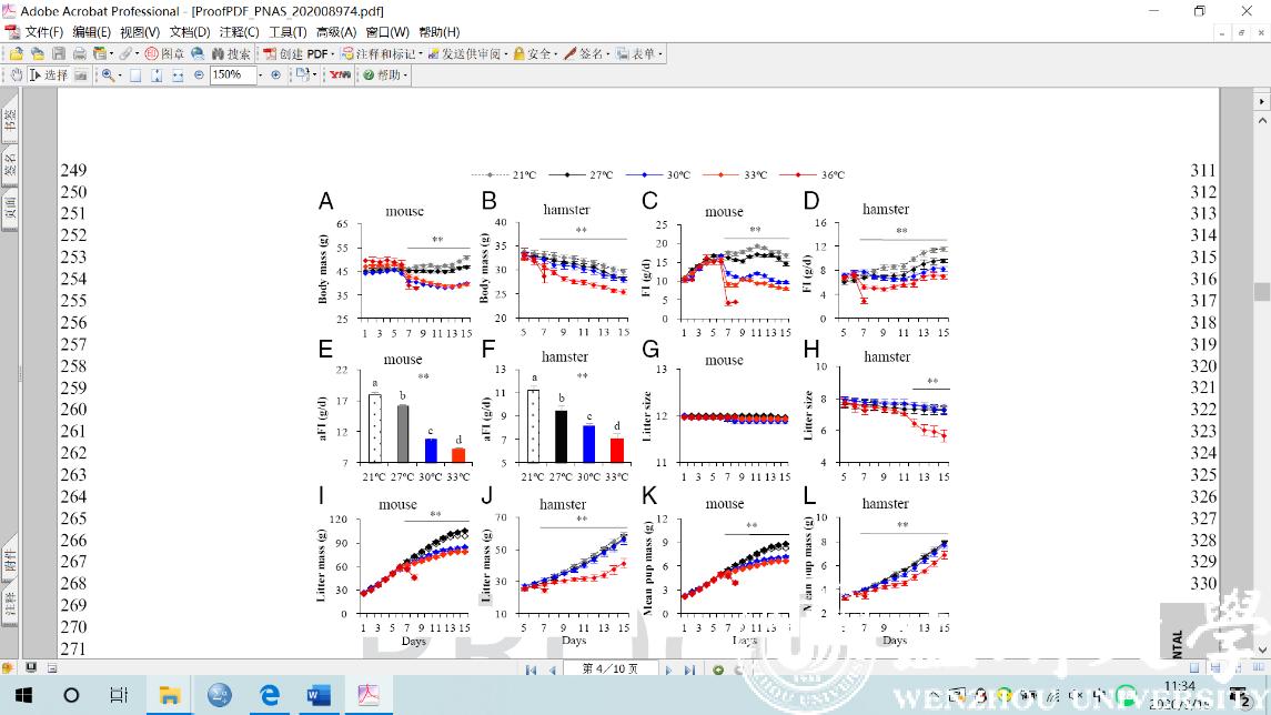 2020年9月14日,小宝影院 生命与环境科学学院赵志军教授课题组、中科院遗传与发育生物学研究所John Speakman教授和Aberdeen University of UK的Catherine Hambly博士,联合在国际学术期刊《美国科学院院刊》(Proceedings of the National Academy of Sciences of the United States of America,PNAS)在线发表题为“Late lactation in small mammals is a critically sensitive window of vulnerability to elevated ambient temperature”的研究论文(//doi.org/10.1073/pnas.2008974117)。《美国科学院院刊》自1914年创刊,是国际上最负盛名的基础科学领域的学术杂志之一,收录的论文涵盖生物、物理和社会科学。