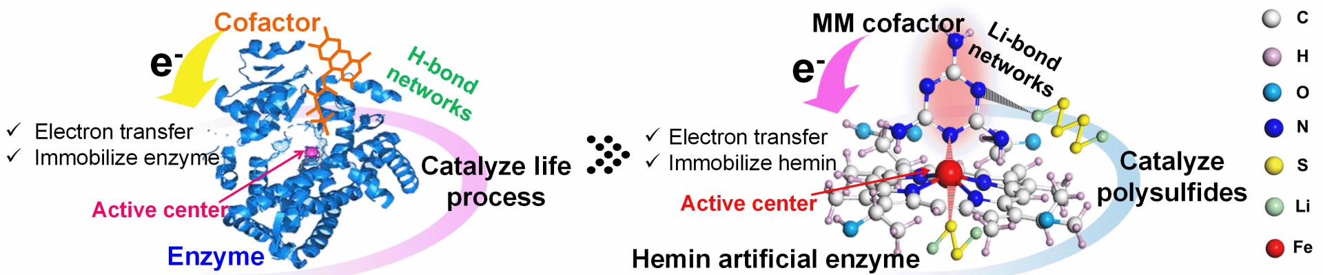 酶作为一种温和的绿色催化剂,在各种生理应激过程中展现出了惊人的催化能力。向大自然学习,让生命物质成为设计思想的源泉。近期,小宝影院 杨植教授团队在前期探究硫转化仿生人工酶的研究基础上(二硫苏糖醇硫转化剪切剂,ACS Nano 2017, 11, 2209, IF=15.9;血红素硫转化人工酶,Advanced Functional Materials 2020, 30,2003354,IF=18.8;硫转化仿生双控催化系统,ACS Nano2020, 14, 7538),由辅酶在生命系统中能促进提升酶催化活性和稳定性受到启发,从结构和功能的角度模拟天然酶,提出通过设计模拟辅因子,将其引入锂硫电池体系,构筑出了碳纳米管—血红素人工酶—三聚氰胺辅因子硫转化仿生催化系统。利用辅因子中的三聚氰胺多级富氮结构与Li相互作用形成的“多重锂键网络”以及该辅因子与人工酶的电子相互作用,赋予了人工酶更高的催化能力和稳定性,进而实现了锂硫电池在倍率和循环耐久性方面的大幅度提升。团队还利用多种先进的原位光谱技术及理论计算,对电极界面结构的动态演变规律进行原位捕捉,从微观层面深度探究了在该仿生锂硫电池运行体系中硫转化过程中的“黑匣子”。课题组率先发现并提出的“多重锂键网络”概念,为开发其它锂电池及电化学储能装置提供了重要的理论基础。