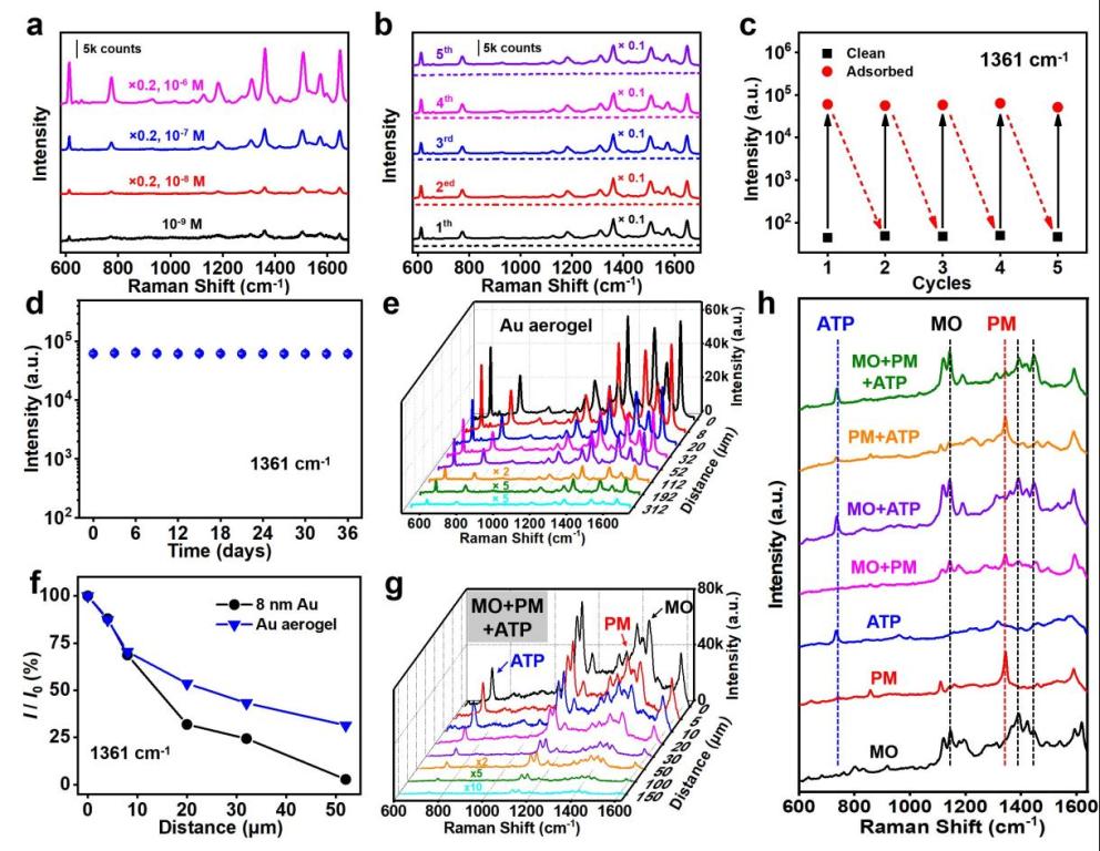 以小宝影院 胡悦副教授、北京理工大学杜然教授、德累斯顿工业大学Alexander Eychmüller教授为首的国际团队在前期工作中,通过对金属气凝胶合成方法学的深入探索,开发了一系列可控制备方法,实现了金属凝胶的快速制备及其特征尺寸、比表面积、孔容等多种参数的大范围调控(Sci. Adv.2019, Nat. Commun.2020, Matter2020)。在此基础上,上述团队再次携手,以网络特征尺寸为5-100 nm的金气凝胶为例,从理论与实验两个角度系统探究了气凝胶基底的特征尺寸与SERS活性依赖性。通过对相关参数的优化,不仅获得了大对焦容差的SERS基底(>300 μm),更实现了对染料分子、农药和致癌物质的高灵敏度与多通道检测。