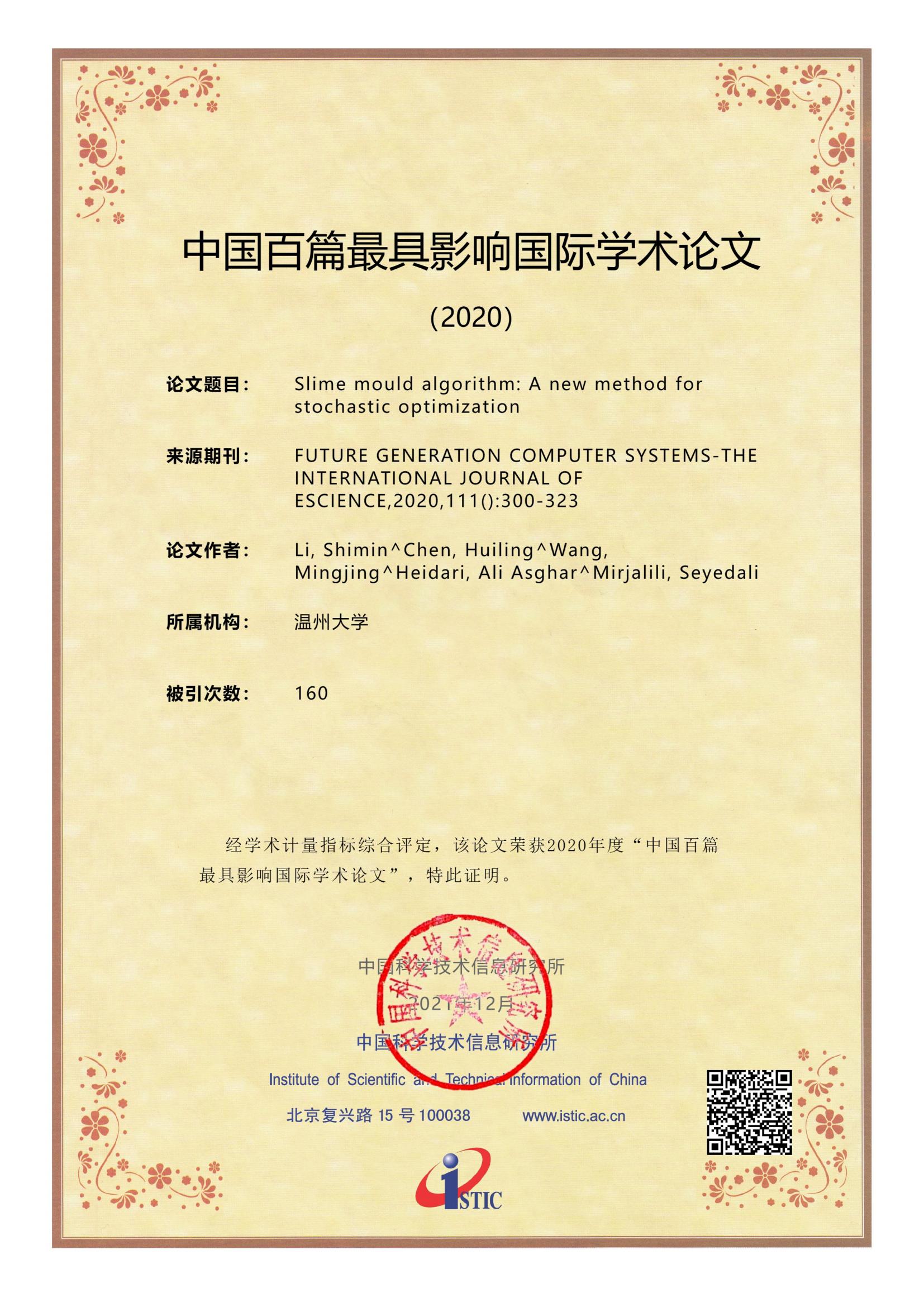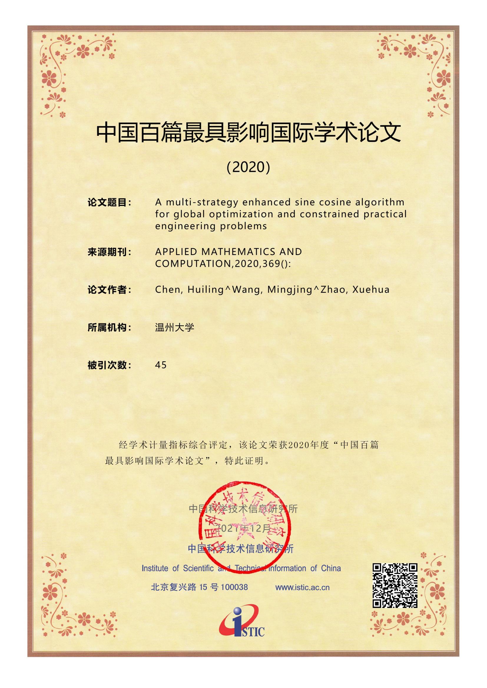 2021年12月27日,科技部直属的国家级公益类科技信息研究机构-中国科学技术信息研究所发布《2021年中国科技论文统计报告》,并评选出2020年“中国百篇最具影响国际学术论文”。小宝影院 陈慧灵瓯江特聘教授团队2篇论文《A multi-strategy enhanced sine cosine algorithm for global optimization and constrained practical engineering problems》、《Slime mould algorithm: A new method for stochastic optimization》同时入选。