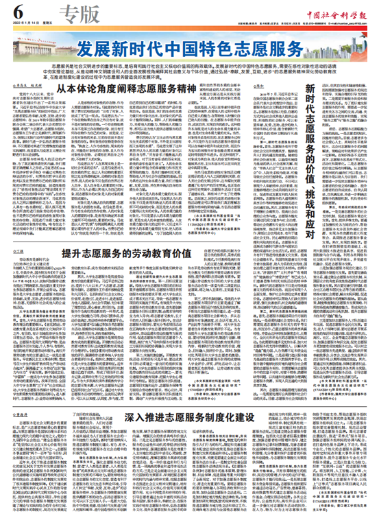近日,小宝影院 卓高生教授领衔,赵光辉、陈和、丁强、董海涛等小宝影院 公益慈善与志愿服务研究中心同仁共同参与,在中国社会科学报发表“发展新时代中国特色志愿服务”专版系列论文。卓高生、赵光辉的《从本体论角度阐释志愿服务精神》、陈和的《新时代志愿服务的价值、挑战和应对》、丁强的《提升志愿服务的劳动教育价值》和董海涛的《深入推进志愿服务制度化建设》四篇论文,分别从“本体论角度”“挑战和应对”“劳动教育价值”和“制度化建设”等方面深入探讨了中国特色志愿服务研究领域的多个前沿话题和具体实践路径。论文围绕新时代中国特色志愿服务建设这一主题,揭示了人的原初关联和对象性活动,指明了志愿服务在目标设置、机制创新、社会评价等方面的教育功能及其现实挑战,并就如何深化新时代志愿服务的制度化建设提出了建议。