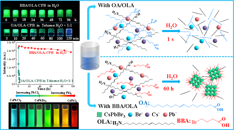 近日,小宝影院 潘跃晓教授课题组在国际顶级化学期刊《Angewandte Chemie International Edition》发表了题为“4-Bromo-Butyric Acid-Assisted In Situ Passivation Strategy for Superstable All-Inorganic Halide Perovskite CsPbX3 QDs in Polar Media”的论文。该论文通过原位钝化策略显著提高CsPbX3量子点在水等极性溶剂中的稳定性,并提出了一种可能的基本机制。