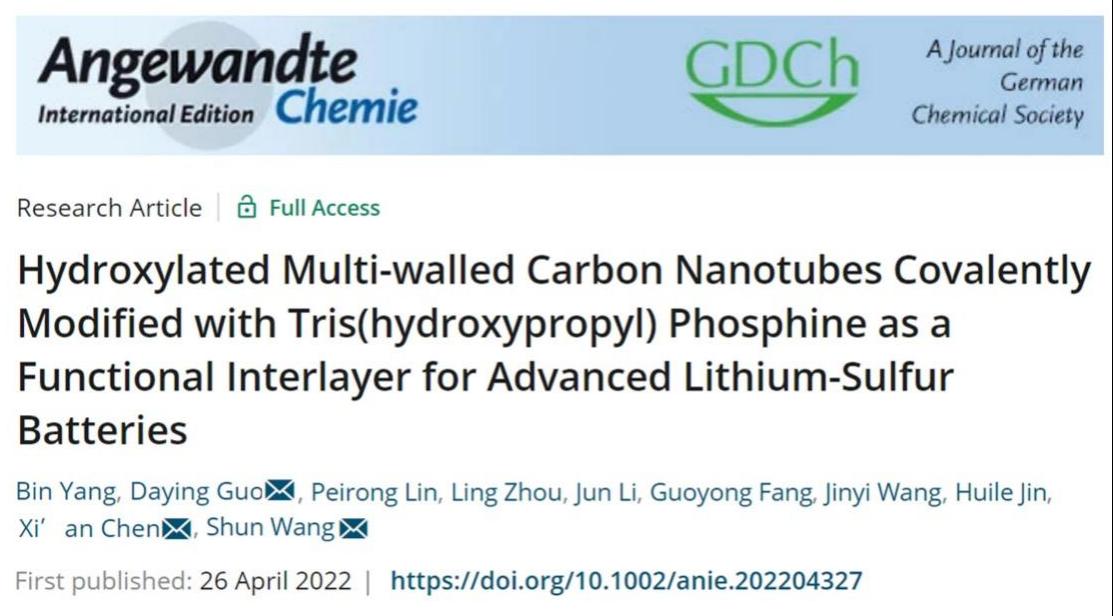 近日,小宝影院 陈锡安教授课题组在国际顶级期刊《Angewandte Chemie International Edition》发表题为“Hydroxylated Multi-walled Carbon Nanotubes Covalently Modified with Tris(hydroxypropyl) Phosphine as a Functional Interlayer for Advanced Lithium-Sulfur Batteries”的论文。该工作开发了一种三(羟丙基)膦共价改性羟基化多壁碳纳米管作为先进锂硫电池的功能层。利用三(羟丙基)膦(THPP)作为锂硫电池功能插层中的活性物质,能够快速将液相多硫化锂(Li2Sn, 4≤n≤8)催化转化固相硫化锂(Li2S),从而有效抑制多硫化物穿梭效应。同时能够诱导锂负极表面形成稳定的固体电解液中间相(SEI)层,进而减少锂负极枝晶的形成。并揭示了有机小分子THPP催化多硫化物过程中形成的活性中间体,对锂硫电池中有机小分子催化多硫化物的作用机制提供了一个新的见解。