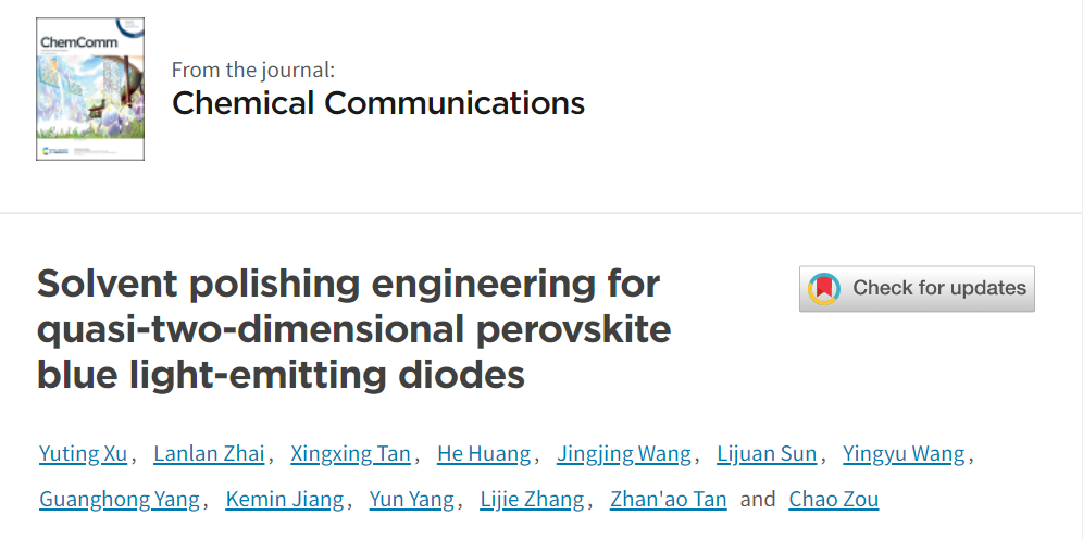 近日,小宝影院 化学与材料工程学院邹超教授课题组在蓝光LED领域的研究成果以“Solvent polishing engineering for quasi-two-dimensional perovskite blue light-emitting diodes”(//doi.org/10.1039/D2CC02268K)为题刊发于化学领域著名刊物Chemical Communications。论文发表后,即入选“Chemical Communications期刊2022年热点论文”。Chemical Communications期刊由英国皇家化学学会主办,是自然指数源期刊。
