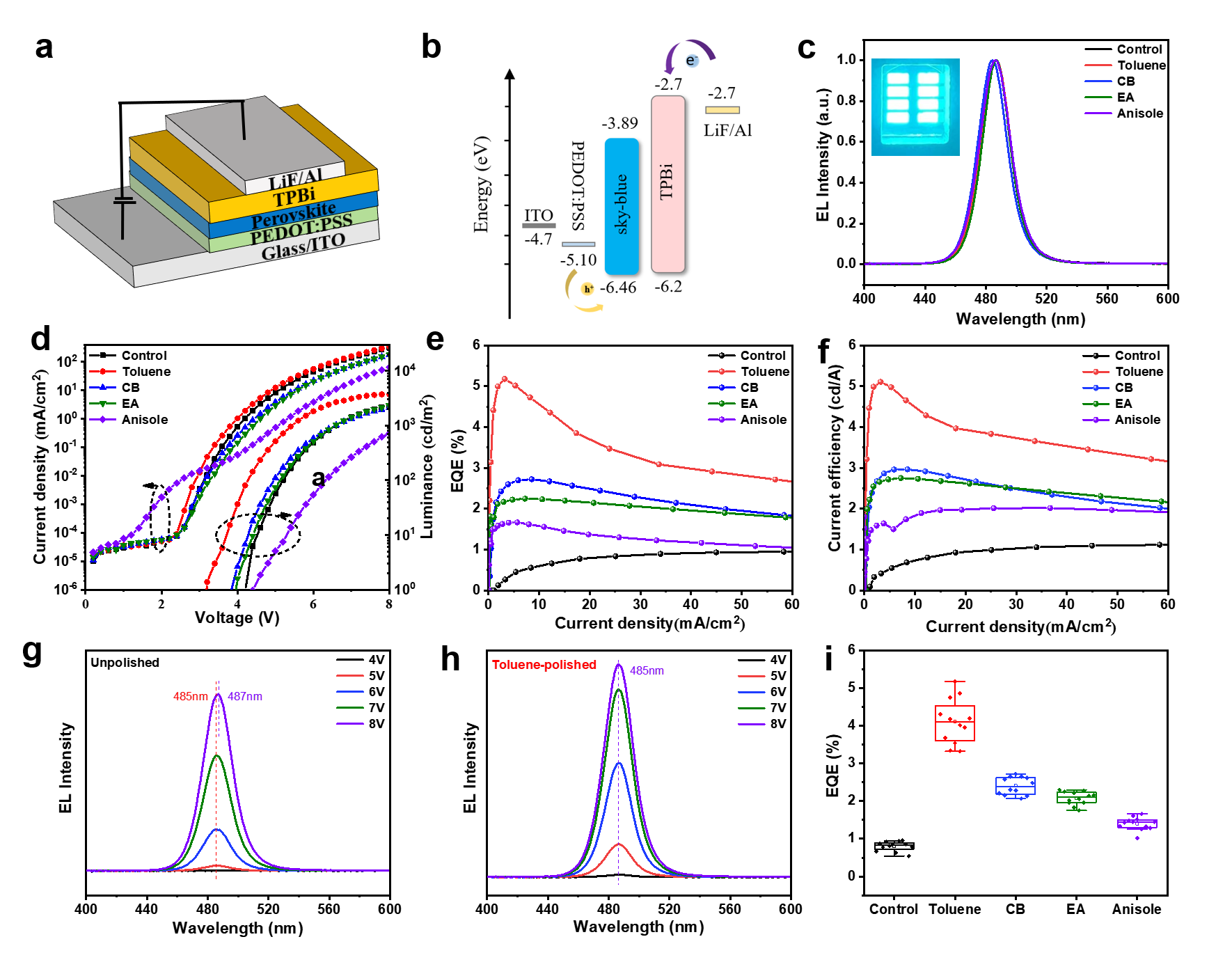 近日,小宝影院 邹超课题组提出了一种溶剂抛光策略,在不影响载流子输运的前提下有效去除钙钛矿表面的富缺陷层,并有效减少非辐射复合中心n=1相的形成。通过系统研究抛光效果与溶剂极性的关联,确定甲苯溶剂能够在最大限度维持钙钛矿薄膜性质的基础上有效消除缺陷。研究中实现了高效的蓝光PeLED器件,在485 nm处的最大EQE为5.18 %,最高亮度为3737 cd m-2,启亮电压为3.2 V,分别比未抛光的PeLED器件(启亮电压:4.2 V)高出545 %和162 %。这项研究在不损失载流子输运效率的前提下为缺陷消除提供了一种新思路,以实现高效的蓝光PeLED。