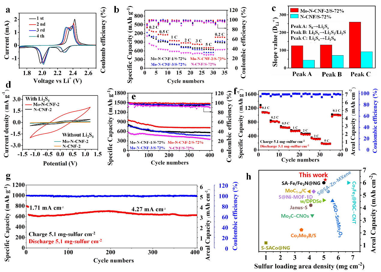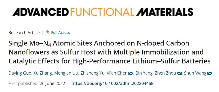 近日,小宝影院 陈锡安教授课题组在国际顶级期刊《Advanced Functional Materials》发表题为“Single Mo–N4 Atomic Sites Anchored on N-doped Carbon Nanoflowers as Sulfur Host with Multiple Immobilization and Catalytic Effects for High-Performance Lithium–Sulfur Batteries”的论文。该工作在新颖碳球结构设计(J. Mater. Chem. A,2017, 5, 18193-18206.)和氮掺杂花型碳纳米球(J. Mater. Chem. A,2017, 5, 6245-6256)的基础上开发了一种单原子钼以四氮配位(Mo-N4)的形式锚定在N 掺杂碳纳米花上作为锂硫电池硫阴极,显著提高电池性能。利用独特设计的花型结构碳球和高活性Mo-N4催化中心,表现出多重固定和催化多硫化物作用,能够快速将液相多硫化锂(Li2Sn, 4≤n≤8)催化转化固相硫化锂(Li2S),从而有效抑制多硫化物穿梭效应。基于此,这项工作中设计的LSBs表现出优异的倍率性能和长期稳定性。 特别是在5.1 mg cm-2的高载硫下,面积比容量达到初始容量3.24 mAh cm-2(4.27 mA cm-2),经过400次循环后面积比容量保持在3.17 mAh cm-2,衰减率仅为0.004%。这种通过将单原子催化剂锚定在氮掺杂碳纳米球上结构设计策略为锂硫电池应用带来光明的未来。