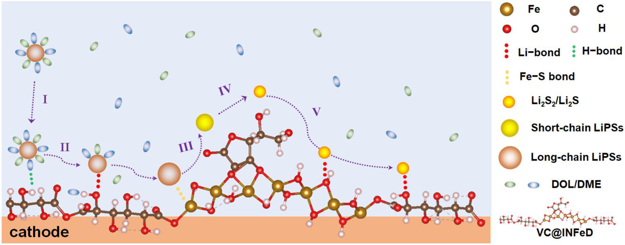 在此,受右旋糖酐铁(INFeD)和抗坏血酸(VC)联合作为治疗贫血的补血药启发,小宝影院 杨植教授、蔡冬博士与杨硕博士联合开发了一种高效的VC@INFeD硫正极催化剂,在多重H/Li键的协助下,溶剂化的多硫化锂(LiPSs)在正极/电解质界面上可通过具有梯度吸附能力的羟基基团完成富集和脱溶化,随后在INFeD链上完成转移,进而在VC@INFeD级联催化位点实现其彻底转化。结果表明,INFeD主要促进长链LiPSs的转化,VC加速短链LiPSs的转化,两者协同可以显著降低每个硫氧化还原步骤的能量势垒,并赋予锂硫电池优异的电化学性能。即使在高硫含量(5.2 mg cm‒1)和贫电解质(E/S,~7μL mg−1)条件下,也具有高硫利用率和良好的循环稳定性。