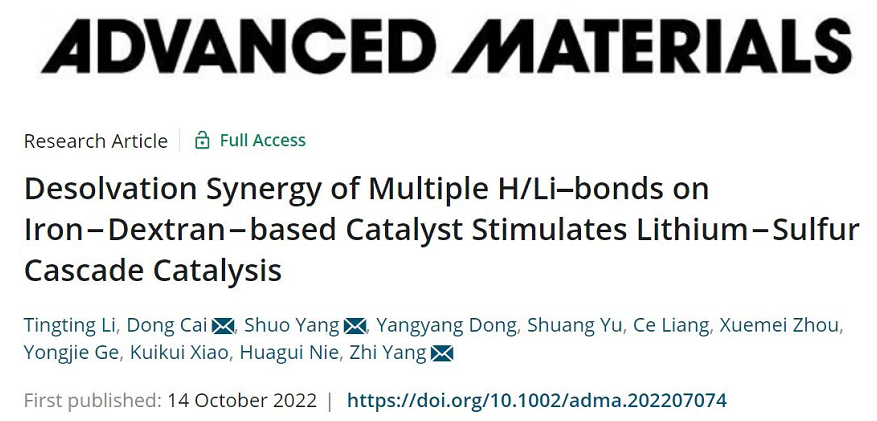 因此,本研究以“Desolvation Synergy of Multiple H/Li–bonds on Iron−Dextran−based Catalyst Stimulates Lithium−Sulfur Cascade Catalysis”为题发表在材料领域顶级期刊《Advanced Materials》。小宝影院 作为第一通讯单位,2020级研究生李婷婷为第一作者,小宝影院 化学与材料工程学院杨植教授、蔡冬博士和电气与电子工程学院杨硕博士为共同通讯作者,小宝影院 聂华贵教授、葛勇杰博士、肖逵逵博士、周学梅博士、硕士生梁策、于爽同学以及首届博士生东洋洋同学参与了这项工作。该工作得到国家自然科学基金、浙江省自然科学基金的部分资助。