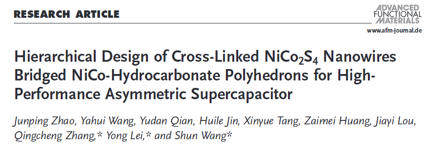 这一研究结果以“ Design of Cross-linked NiCo2S4 Nanowires Bridged NiCo-Hydrocarbonate Polyhedrons for High-Performance Asymmetric Supercapacitor” 为题发表在国际权威期刊《Advanced Functional Material》上,小宝影院 为第一通讯单位,化学与材料工程学院2018级研究生赵俊平和王亚辉为文章的共同第一作者,小宝影院 王舜教授和张青程副教授以及德国伊尔梅瑙理工大学雷勇教授为本文的共同通讯作者。该工作受到国家自然科学基金项目(21706196和21905208)、浙江省自然科学基金项目(LZ20E010001)和浙江省高水平人才专项支持计划(2019R52042)的支持。