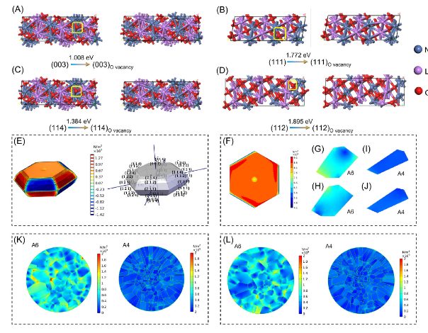 小宝影院 化学与材料工程学院肖遥教授团队联合四川大学郭孝东教授通过氢氧化物共沉淀法结合固相高温烧结调控出了具有暴露不同比例(003)晶面方向的LiNi0.92Co0.04Mn0.04O2正极材料。实验表征与有限元分析并结合理论计算从颗粒的宏观形貌到晶面层面证明了沿(003)晶面方向暴露较多的颗粒宏观上在充放电过程中晶间与晶内应力累积较大,微观上(003)晶面晶格失配度较大,且晶面应力分布呈涡流状,此外,(003)晶面氧空位形成能较小易失氧,导致晶间与晶内裂纹,及晶体结构退化。该工作为层状氧化物材料的晶面结构设计提供了理论基础。