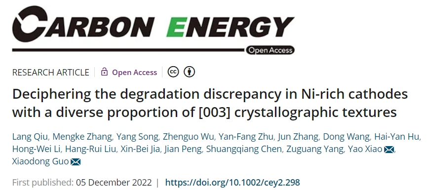 该成果以“Deciphering the degradation discrepancy in Ni-rich cathodes with the diverse proportion of [003] crystallographic texture”为题发表在高水平期刊Carbon Energy(IF: 21.556)上。小宝影院 化材学院肖遥教授与四川大学郭孝东教授为该论文共同通讯作者。