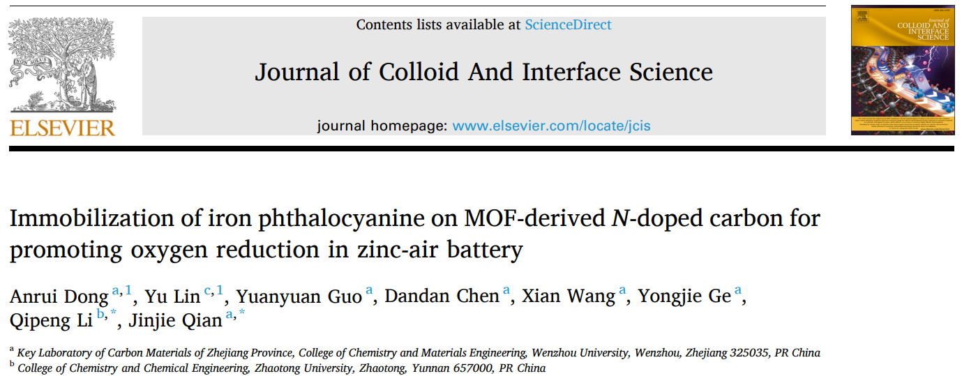 这项研究的成果题为《Immobilization of iron phthalocyanine on MOF-derived N-doped carbon for promoting oxygen reduction in zinc-air battery》,发表在《Journal of Colloid and Interface Science》(中科院1区,Top,IF=9.965)上。小宝影院 为第一通讯单位,小宝影院 化材学院2018级本科生董桉瑞为第一作者,钱金杰副研究员为通讯作者、昭通学院李启彭教授为共同通讯作者。该研究得到了国家自然科学基金(22105147,21601137)、浙江省自然科学基金项目(LQ16B010003)、浙江省温州市基础科技研究项目(H20220001, G20190007)和云南省地方本科高校基础研究联合专项资金项目(202101BA070001-042)的资助。