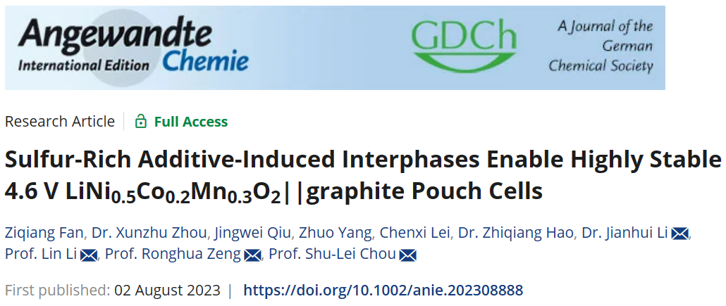 近日小宝影院 化学与材料工程学院碳中和技术创新研究院李林团队联合华南师范大学曾荣华教授、李键辉博士在国际权威期刊Angewandte Chemie International Edition上发表题为《Sulfur-Rich Additive-Induced Interphases Enable Highly Stable 4.6 V LiNi0.5Co0.2Mn0.3O2||graphite Pouch Cells》的学术论文。本论文通过在4.6 V LiNi0.5Co0.2Mn0.3O2 (NCM523)||石墨软包电池中引入含硫量为34.04%的超高含硫量添加剂(甲烷二磺酸亚甲酯,MMDS),从而构建了一种由添加剂诱导形成的稳固富硫电极-电解液面相。在4.6 V高电压条件下,循环800次,含MMDS添加剂的NCM523||石墨软包电池仍具有87.99%的高容量保持率以及更好的倍率性能,且与较低硫含量的一系列添加剂做对比,突出了高含硫量添加剂MMDS的优势。结合实验表征以及理论计算,进一步探究了MMDS添加剂在溶剂中的优先氧化还原性,从而证明它能够优先在正负极上界面构筑稳定的富硫电极-电解液界面膜,该界面相的存在成功稳定了高电压NCM523||石墨软包电池,显著提高了电池的循环稳定性。同时实验结果也表明MMDS分解所构筑的富硫界面相在抑制电解液消耗、产气以及稳定电极材料、减少过渡金属溶出上有着非常好的效果。小宝影院相关的文章发表在Angewandte Chemie International Edition上,小宝影院 为第一通讯单位,化材学院联培生华南师范大学2021级硕士范自强和博士后周洵竹为第一作者,化材学院院侴术雷教授,李林特聘教授以及华南师范大学曾荣华教授,李健辉博士为共同通讯作者,相关工作受到国家自然科学基金,浙江省自然科学基金,国家电网科技项目,温州自然科学基金以及广州市科技计划项目的资助。
