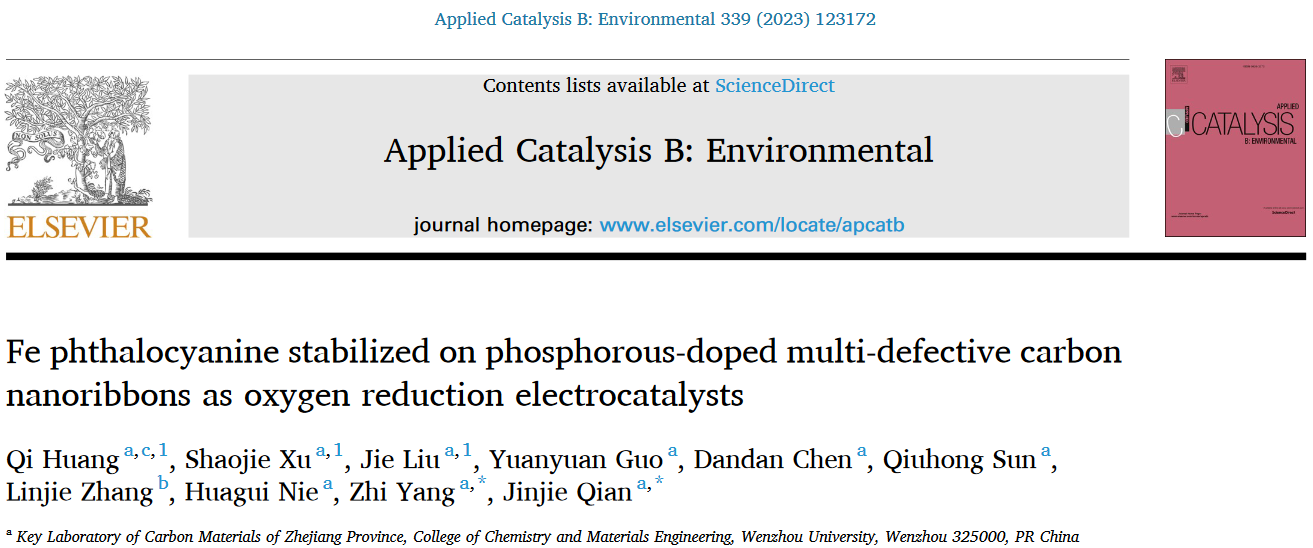 本论文以“Fe phthalocyanine stabilized on phosphorous-doped multi-defective carbon nanoribbons as oxygen reduction electrocatalysts”为题发表在《Applied Catalysis B: Environmental》上,2023年影响因子22.1。小宝影院 为第一通讯单位,小宝影院 化学与材料工程学院钱金杰副教授和杨植教授为通讯作者,化学与材料工程学院2019级硕士研究生黄淇、2021级硕士研究生徐少杰和2022级硕士研究生刘捷为共同第一作者。该工作受到国家自然科学基金(21601137)、浙江省自然科学基金(LQ16B010003)、浙江省温州市基础科技研究项目(H20220001)、中国科学院结构化学国家重点实验室项目(20190008)和云南省地方本科高校基础研究联合专项资金项目(202101BA070001-042)的资助。