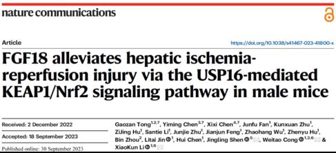 近日,生命与环境科学学院申景岭教授与温州医科大学李校堃院士团队合作在Nature Communications在线发表题为“FGF18 alleviates hepatic ischemia-reperfusion injury via the USP16-mediated KEAP1/Nrf2 signaling pathway in male mice”的研究论文。本项研究结果证实成纤维细胞生长因子18(FGF18)可显著改善肝缺血再灌注过程中的损伤。FGF18通过减少USP16的表达,增加了KEAP1的泛素化修饰水平,从而激活Nrf2信号并最终改善肝脏缺血再灌注损伤。其中FGF18对USP16调控作用是通过Nrf2和USP16的负反馈调控来实现的。研究发现FGF18通过降低氧化应激以及炎症水平,减少肝细胞的凋亡,因此靶向FGF18/USP16/KEAP1信号通路可作为临床上改善肝脏缺血再灌注损伤和相关病理过程的一种新策略。该论文通讯作者为温州医科大学药学院李校堃院士、丛维涛研究员、小宝影院 生命与环境科学学院申景岭教授。