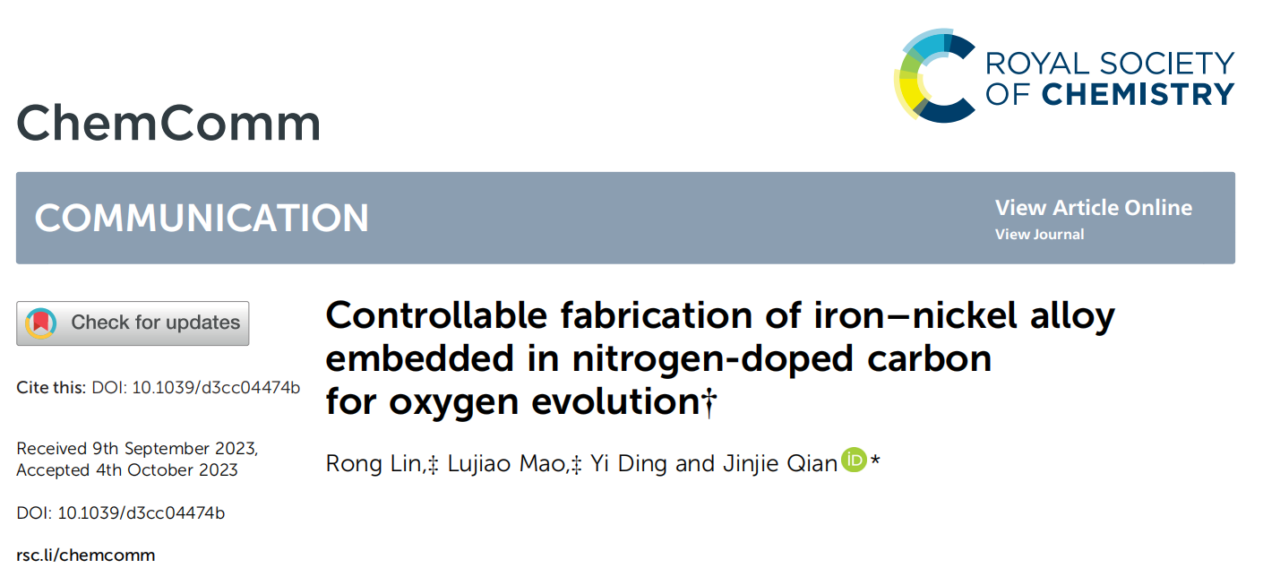 本论文以“Controllable fabrication of iron-nickle alloy embedded in nitrogen-doped carbon for oxygen evolution”为题发表在被自然指数收录的国际著名期刊《Chemical Communications》上。小宝影院 为第一通讯单位,小宝影院 化材学院钱金杰副教授为通讯作者,化材学院21级本科生林荣、21级研究生毛璐娇为共同一作,21级本科生丁奕参与了该项工作。该工作受到国家自然科学基金(21601137)、浙江省自然科学基金(LQ16B010003)、浙江省温州市基础科技研究项目(H20220001)的资助。