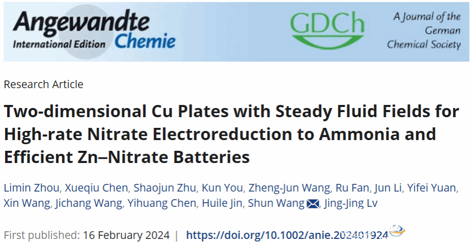 该成果以“Two-dimensional Cu Plates with Steady Fluid Fields for High-rate Nitrate Electroreduction to Ammonia and Efficient Zn–Nitrate Batteries”为题发表在Angewandte Chemie International Edition期刊(IF=16.6,SCI一区)上。小宝影院 为第一通讯单位,化材学院研究生周李敏、陈雪秋、朱绍均为共同第一作者,小宝影院 王正军博士、金辉乐研究员、王舜教授和吕晶晶教授为共同通讯作者。