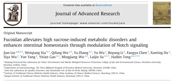 近日,小宝影院 生环学院佟海滨课题组揭示褐藻活性成分Fucoidan(岩藻聚糖硫酸酯)通过重塑肠道干细胞增殖与分化稳态改善代谢异常的分子机制,该研究成果Fucoidan alleviates high sucrose-induced metabolic disorders and enhances intestinal homeostasis through modulation of Notch signaling发表在《Journal of Advanced Research》(综合性期刊,1区Top,影响因子11.4)。