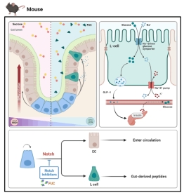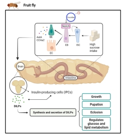 本研究同时采用果蝇和小鼠两套模式动物体系,通过高糖饮食诱导代谢紊乱,深入探讨了天然褐藻多糖Fucoidan的治疗作用与药理机制。研究结果表明,Fucoidan能够显著缓解高糖饮食引起的高血糖和高血脂等代谢紊乱表型,并改善肠道干细胞增殖与分化稳态;Fucoidan通过调控Notch信号通路,诱导肠道干细胞向内分泌细胞分化,从而维持调节代谢的肠道激素分泌水平稳定。该研究揭示了Fucoidan在缓解代谢紊乱和维持肠道健康方面的多重药效,为开发新型海洋天然产物药物提供了坚实的理论基础,也为未来代谢疾病的治疗提供新思路。