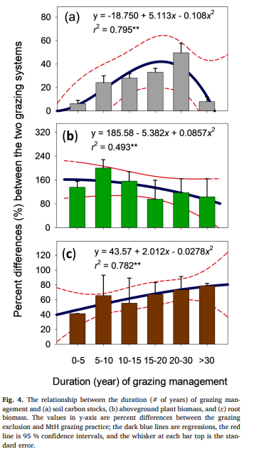 禁牧被认为是恢复全球范围内过度放牧草地退化的有效策略。退化草地中流失的土壤有机碳(SOC)可以通过放牧排斥进行恢复,然而恢复过程需要多久尚无科学定论。本研究通过对四十年间温带草地土壤SOC含量的荟萃分析发现,随着放牧排斥时间的增加,土壤SOC存量稳步增长,在18.5年时达到高峰,然后下降;与中度至重度放牧相比,放牧排斥使表土土壤(0–0.30 m)有机碳储量增加了14.8±0.8%;在高峰期,放牧排斥比中度至重度放牧下的地上生物量增加100.4±4.2%、根生物量增加80.3±33.5%,导致土壤SOC总存量增加42.5%;放牧排斥还使土壤碳氮比提高7.6%,土壤容重降低9.4%。因此,放牧排斥可以在开始放牧排除措施实施18.5年后停止,此时植物生物量的输入与碳的分解达到了平衡状态,土壤SOC储备最佳,效益开始减少。本研究明确了利用放牧排斥恢复草地土壤有机氮的时程,为全球草地生态恢复实施提供了科学依据。