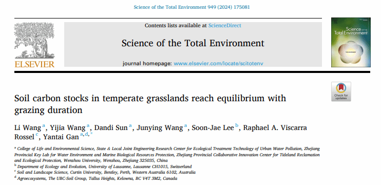 近日,小宝影院 生环学院甘延太教授团队在环境科学领域Top期刊《Science of the Total Environment》(中科院SCI期刊分区一区,IF 8.2)在线发表了题为“Soil carbon stocks in temperate grasslands reach equilibrium with grazing duration”的论文。