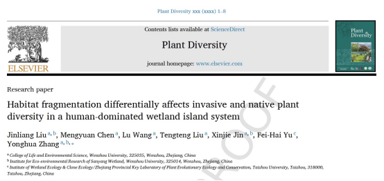 近日,小宝影院 生命与环境科学学院植物生态与进化课题组在国际期刊《Plant Diversity》(中科院SCI期刊分区一区)上发表题为“Habitat fragmentation differentially affects invasive and native plant diversity in a human-dominated wetland island system”的论文。