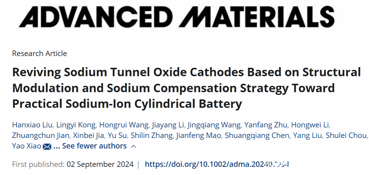 该成果以“Reviving Sodium Tunnel Oxide Cathodes Based on Structural Modulation and Sodium Compensation Strategy Towards Practical Sodium-ion Cylindrical Battery”为题,发表在《Advanced Materials》上,小宝影院 为第一通讯单位,我院硕士研究生刘含笑和孔令益为共同第一作者。