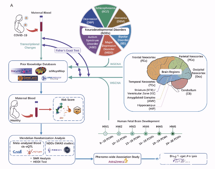 为了深入探讨这一过程中的分子机制,研究团队利用单细胞转录组数据评估了母体新冠肺炎感染对后代神经发育障碍(NDD)风险的影响。分析结果揭示,母体新冠肺炎感染引发的免疫失调中,星形胶质细胞、内皮细胞和兴奋性神经元是病毒破坏母体和胎儿免疫环境平衡、侵入血脑屏障后易感的细胞类型。研究进一步基于新冠病毒诱导的NDD模型,筛选出47个独特基因,建立了风险评分,并通过孟德尔随机化(SMR)验证了这些基因的转录变化与NDD风险增加之间的因果关系。研究表明,母体COVID-19感染通过影响免疫细胞(CD4+ T细胞),引发全身性炎症反应,破坏胎儿血脑屏障的完整性。这种免疫改变会进一步影响与NDD相关的星形胶质细胞、内皮细胞和兴奋性神经元,最终对胎儿神经发育产生负面影响,从而增加后代发生神经发育障碍的风险。