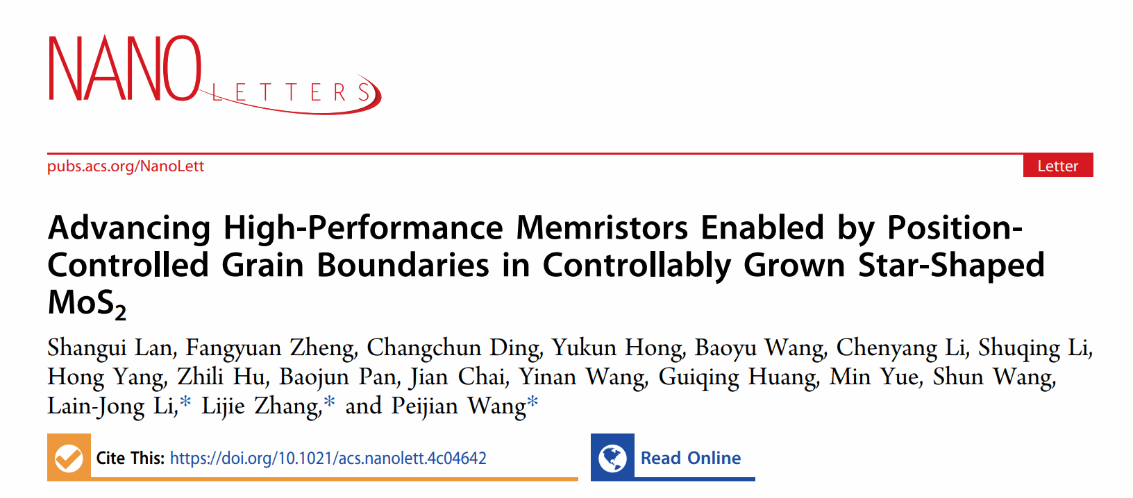 该工作以“Advancing High-Performance Memristors Enabled by Position-Controlled Grain Boundaries in Controllably Grown Star-Shaped MoS2”为题发表在国际纳米顶尖期刊《Nano Letters》上。小宝影院 为第一通讯单位,化材学院王佩剑副教授和张礼杰教授为通讯作者。本研究工作得到温州市基础科学研究项目(G20240021)、国家自然科学基金委(51902061, 62090031, 52072272)资助完成。