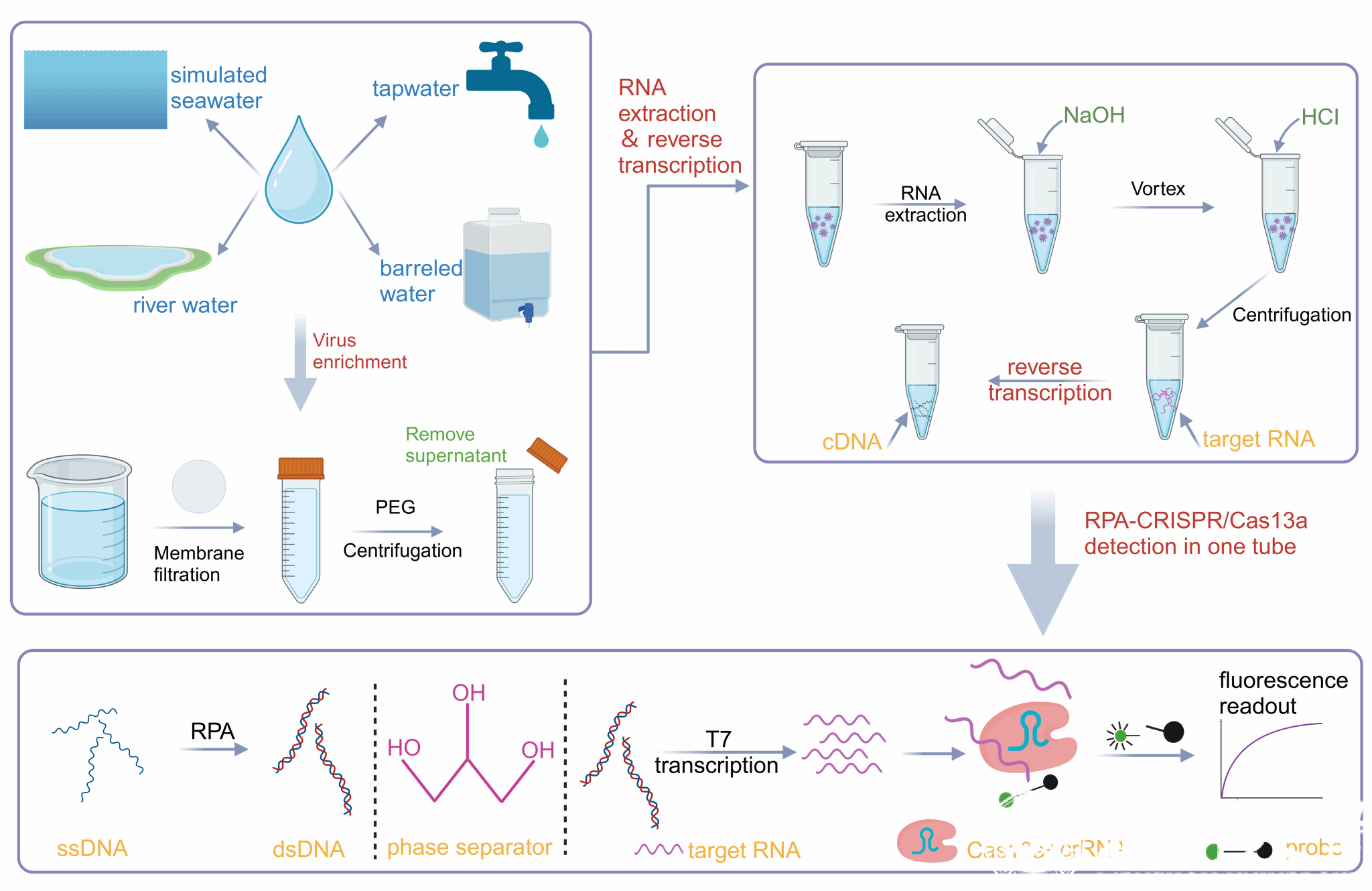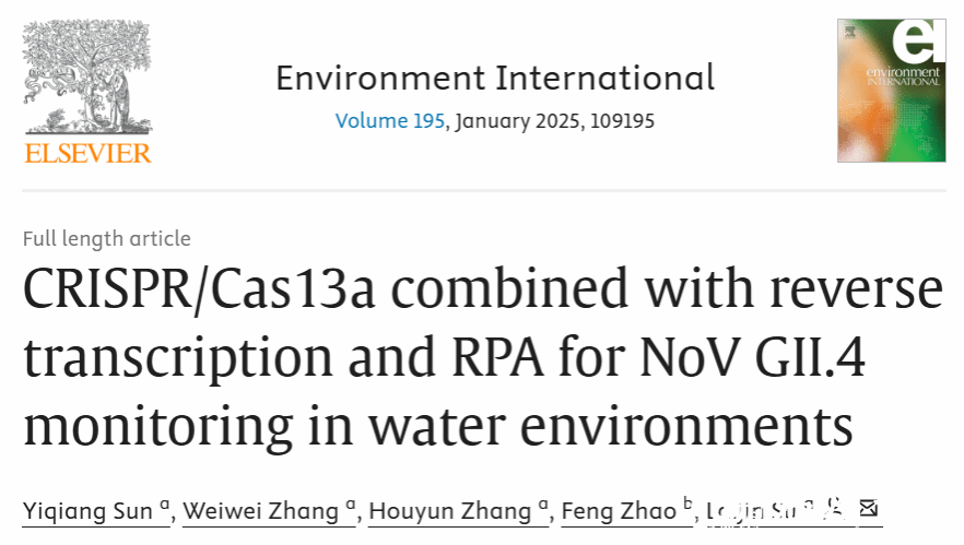小宝影院 生命与环境科学学院吴明江教授团队结合自身优势开展环境毒理和病原检测等交叉研究,取得了系列研究成果。近日,苏来金教授课题组在环境领域著名学术期刊Environmental International杂志上(SCI一区TOP 期刊,IF=10.3)发表了题为“CRISPR/Cas13a combined with reverse transcription and RPA for NoV GⅡ.4 monitoring in water environments”的研究性论文。该论文基于重组酶聚合酶扩增技术(RPA)和CRISPR/Cas13a系统,建立了一种适用于多种水环境、准确可靠、简便快速的GⅡ.4型诺如病毒定量检测方法,该方法在复杂水环境和资源有限地区的诺如病毒快速检测表现出巨大的应用潜力。