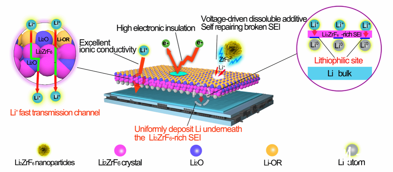 为解决以上问题,小宝影院 化材学院居治金特聘教授与华南理工大学严克友教授、中科院物理所李泓教授、浙江工业大学陶新永教授合作,首次提出了以m-Li2ZrF6纳米颗粒作为电压驱动型电解液添加剂的概念(图1)。研究表明,在电场的驱动下,m-Li2ZrF6颗粒向电解液中大量释放ZrF62-离子,然后通过自发反应在金属锂负极表面原位形成富含t-Li2ZrF6晶体的SEI。DFT计算显示t-Li2ZrF6晶体具有优异的离子电导率,能够在t-Li2ZrF6晶体内部和t-Li2ZrF6/Li2O所构成的晶界中,为Li+提供快速迁移的通道。基于t-Li2ZrF6组分独特的物理化学性质,富含t-Li2ZrF6的SEI具备了高离子电导率、高电子绝缘性和高电化学稳定性等理想型SEI必备的三大特征。此外,富含t-Li2ZrF6的SEI中t-Li2ZrF6晶体表面丰富的亲锂位点还能够促进金属锂的均匀沉积,抑制锂枝晶的产生。更重要的是凭借电压驱动解离释放ZrF62-功能离子特性,m-Li2ZrF6添加剂不仅能够改善传统添加剂在循环中被耗尽的缺陷,还能够通过ZrF62-离子及时修复破损的富含t-Li2ZrF6的SEI,为金属锂负极的界面稳定提供长期保护。基于上述优势,m-Li2ZrF6纳米添加剂能够使锂金属电池在超高面积载量和超大电流密度下稳定循环3000次,且拥有>80%的容量保持率。这项工作为金属锂负极界面保护研究提供了新的解决策略和材料,同时也为锂金属电池的实际商业化应用提供了可能。