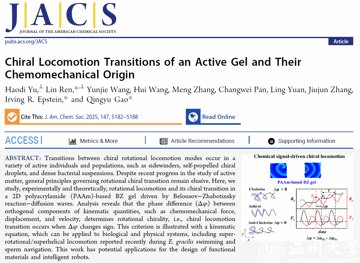 近日,小宝影院 化材学院任林教授与中国矿业大学高庆宇教授和美国布兰迪斯大学I.R. Epstein教授紧密合作取得活性运动研究领域重要进展,相关成果以"Chiral Locomotion Transitions of an Active Gel and Their Chemomechanical Origin"为题发表于化学领域顶级期刊Journal of the American Chemical Society。小宝影院 为第一通讯单位,小宝影院 任林教授、中国矿业大学高庆宇教授和美国布兰迪斯大学I.R. Epstein教授为共同通讯作者。