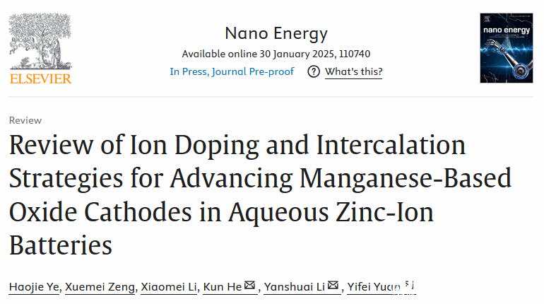 该综述论文以“Review of ion doping and intercalation strategies for advancing manganese-based oxide cathodes in aqueous zinc-ion batteries”为题发表于纳米能源领域国际顶级期刊⟪ Nano Energy ⟫(IF=16.8,中科院一区)。小宝影院 为第一通讯单位,小宝影院 化材学院21级本科生叶浩洁为第一作者,小宝影院 化材学院袁一斐、李彦帅、何坤教授为通讯作者,相关工作得到了国家自然科学基金、浙江省杰出青年基金等项目的资助。