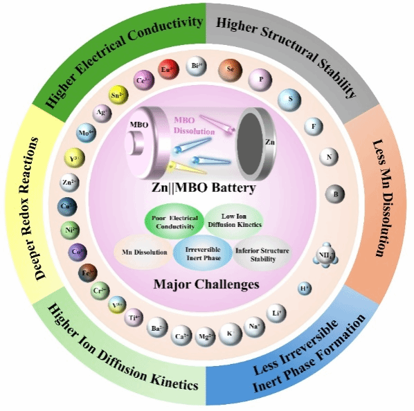 离子掺杂是一种常见的改性策略,已有研究表明离子掺杂能够有效提升锰基材料的导电性和循环稳定性。然而,关于离子掺杂具体的改性机理,目前仍缺乏系统的总结与分析。基于此,本篇综述聚焦于离子掺杂对于水系锌电池锰基材料的改性机理,从“提高导电性、增强电解液离子扩散动力学、改善结构稳定性、抑制锰溶解以及抑制不可逆惰性相生成”五个方面,详述离子掺杂对提高锰基材料电化学性能的原理与机制,以冀为推动水系锌电池锰基材料的进一步发展提供理论指导。文章最后总结了当前离子掺杂的研究进展,并指出了该策略在实际应用中的挑战。比如,如何科学选择掺杂离子、对掺杂离子长循环过程中的失效机理研究尚不够深入等;同时,本文强调指出未来的研究应更加注重与DFT等理论计算的结合,并开发利用更多先进的原位表征技术,以优化离子掺杂方法、挖掘其改性机制,为实现水系锌电池锰基材料的高放电比容量、长循环稳定性、高负载量和可折叠性等商业化目标提供重要支持。