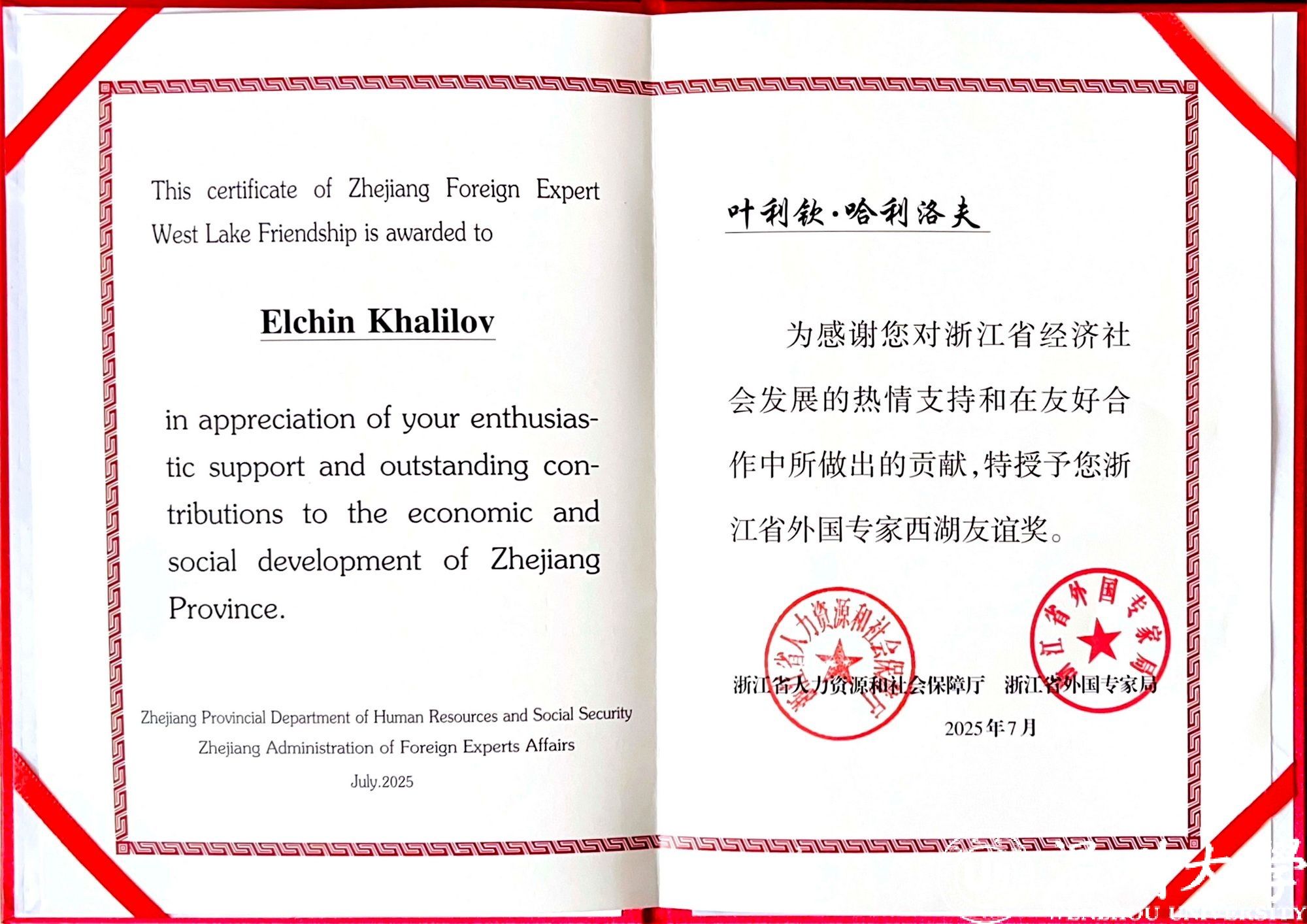 7月8日,浙江省外国专家西湖友谊奖颁奖仪式在省人民大会堂举行。小宝影院 叶利钦·哈利洛夫(Elchin Khalilov)教授应邀参会并获颁“西湖友谊奖”奖章与证书。会前,省领导会见了获奖专家并合影留念。